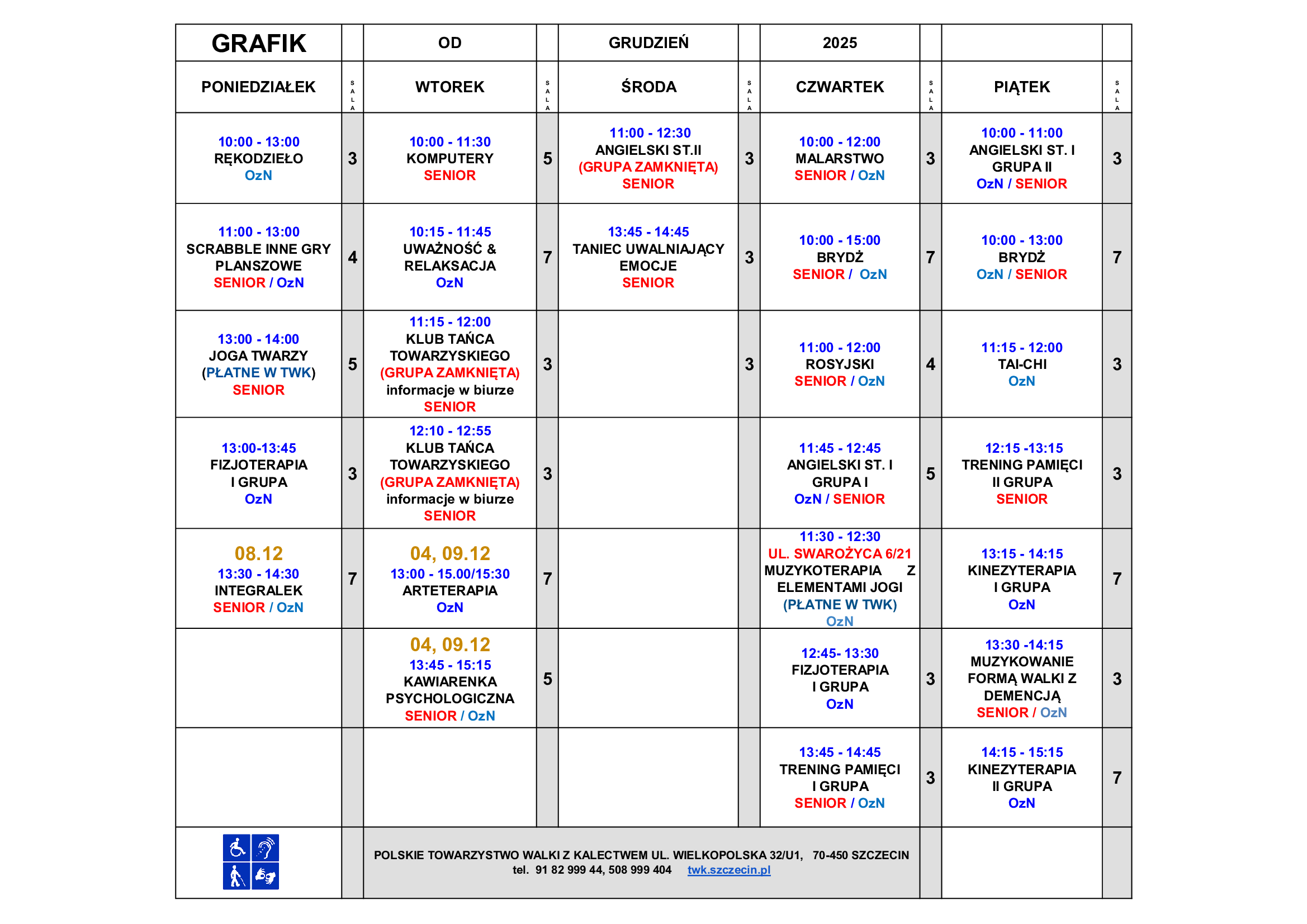 | 8.12 13:30-15:30 INTEGRALEK SENIOR / O.N | 7 | 04,09.12 13:00 – 15:00 /15:30 ARTETERAPIA ON | 7 | 11:30 – 12:30 MUZYKOTERAPIA Z ELEMENTAMI JOGI – UL. SWAROŻYCA 6/21 (PŁATNE W TWK) O.N. | 13:15-14:15 KINEZYTEWRAPIA I GRUPA O.N. | 7 | |||||||